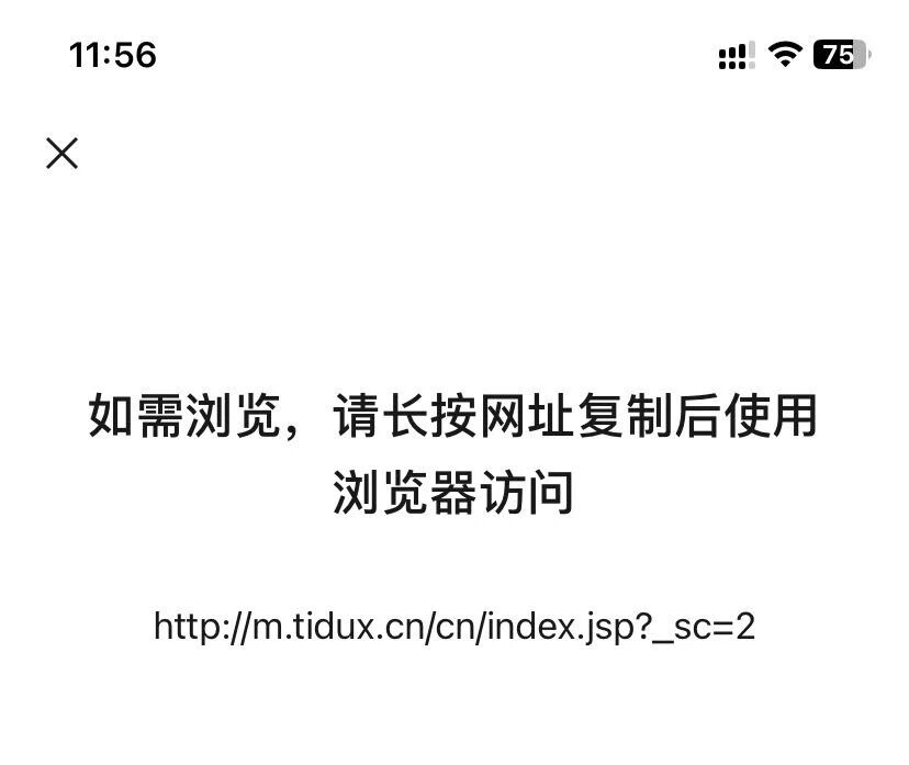 只提示:“如需浏览,请长按网址复制后使用浏览器访问http://m.tidux.cn/cn/index.jsp?_sc=2“,其余域名http://www.tidux.cn等也一样。