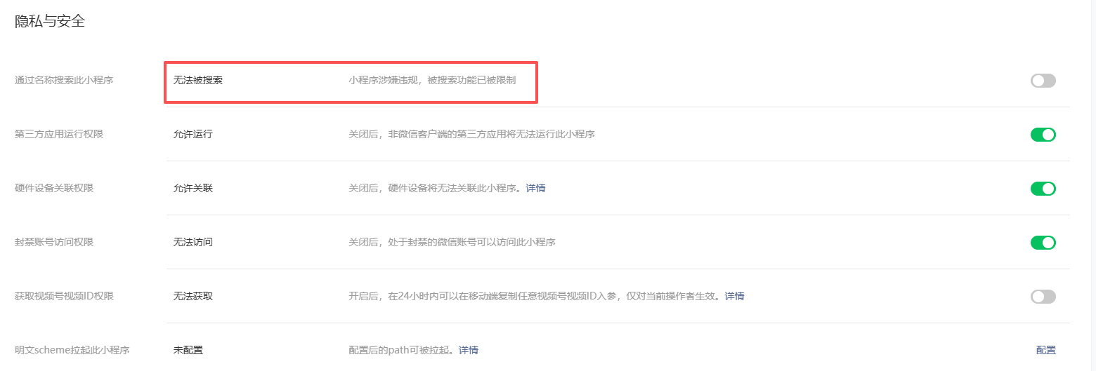 你好,若小程序搜索不到,建议先在MP后台自查以下信息: