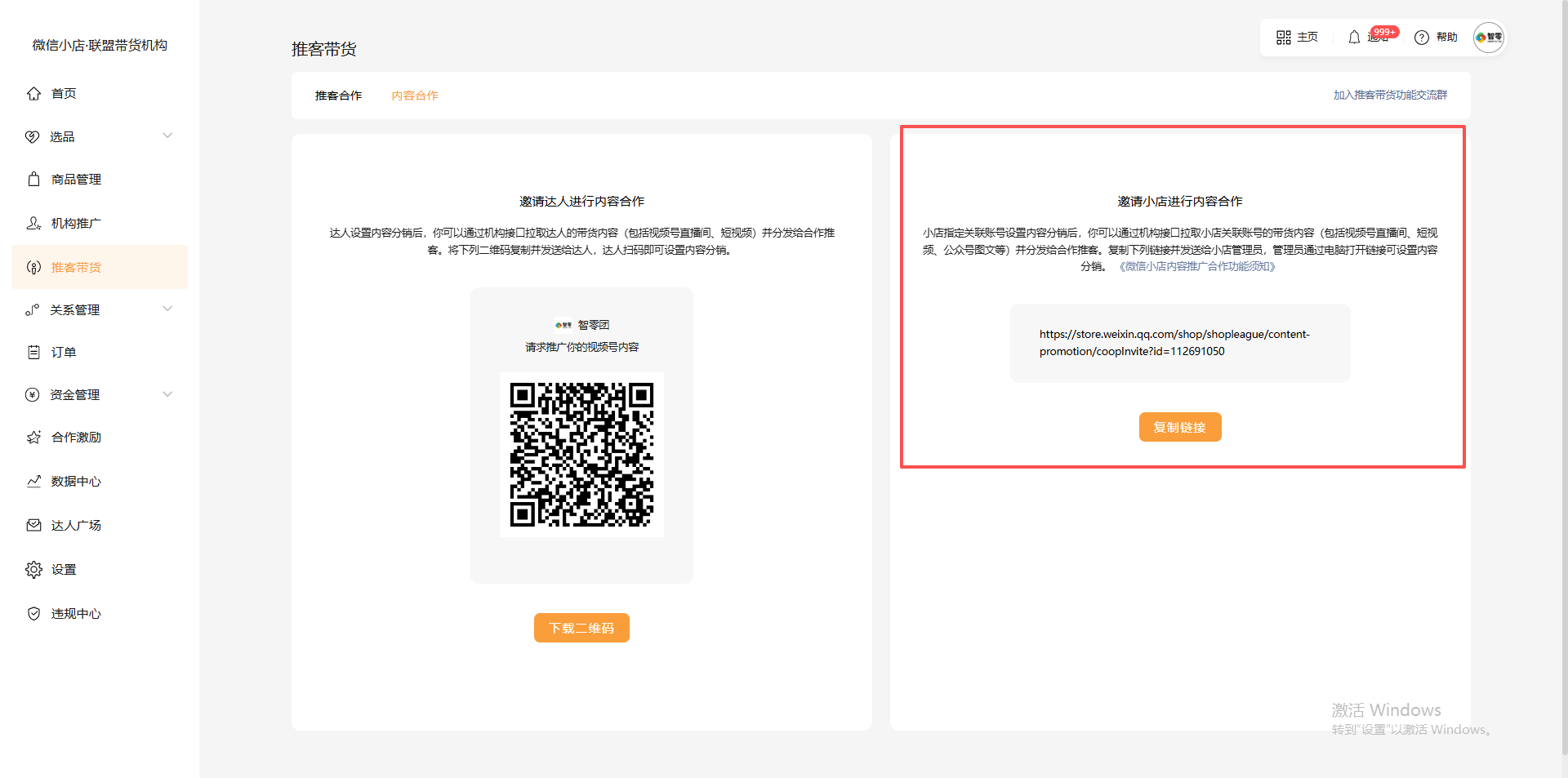 说明该小店跟联盟机构没有推客合作关系,上面接口只是普通的达人推广商品合作,下图是推客业务与小店合作的邀请入口。