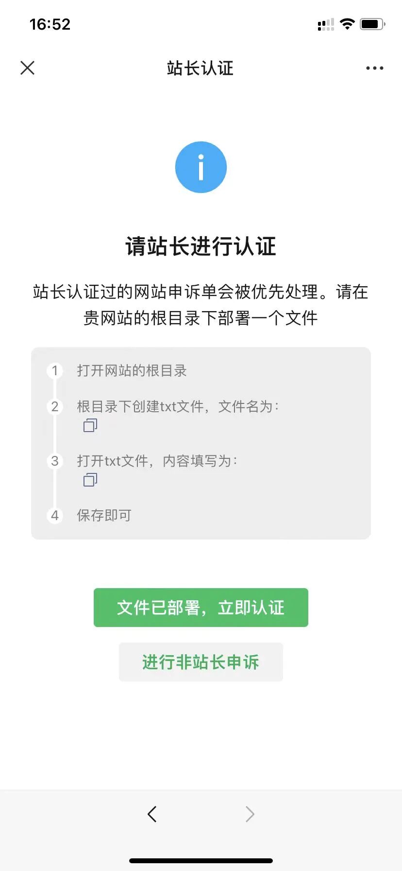 新域名被微信禁封,申请恢复访问时,选择站长,要求复制文件名,文件内容部署。可是什么东西都复制不到!无法完成部署。