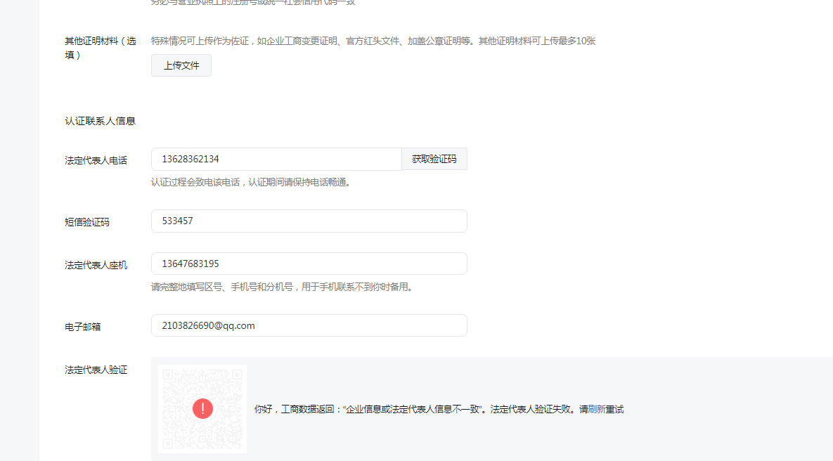 您好,我注册公众号显示企业信息或法定代表人信息不一致?我提供的信息肯定是一致的,工商执照没有变更过,之前也注册过一个公众号,是成功了的,现在也是正常使用,请问这是怎么回事,谢谢?