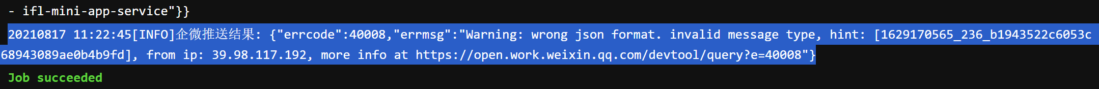20210817 11:22:45[INFO]企微推送结果: {"errcode":40008,"errmsg":"Warning: wrong json format. invalid message type, hint: [1629170565_236_b1943522c6053ca68943089ae0b4b9fd], from ip: 39.98.117.192, more info at https://open.work.weixin.qq.com/devtool/query?e=40008"}