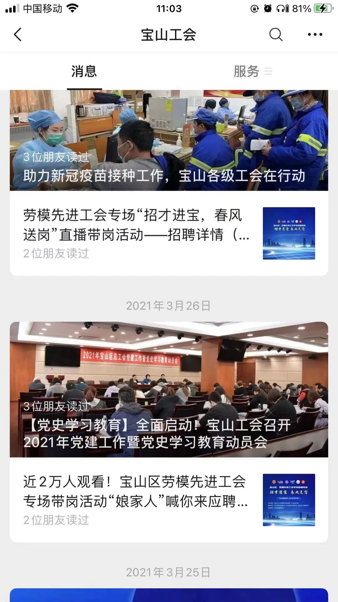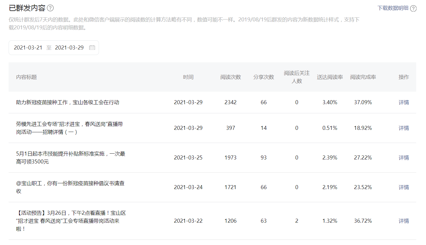 统计-内容分析-单篇群发,未统计到这两篇数据,公众号为“宝山工会”,【党史学习教育】全面启动!宝山工会召开2021年党建工作暨党史学习教育动员会;近2万人观看!宝山区劳模先进工会专场带岗活动“娘家人”喊你来应聘好工作!