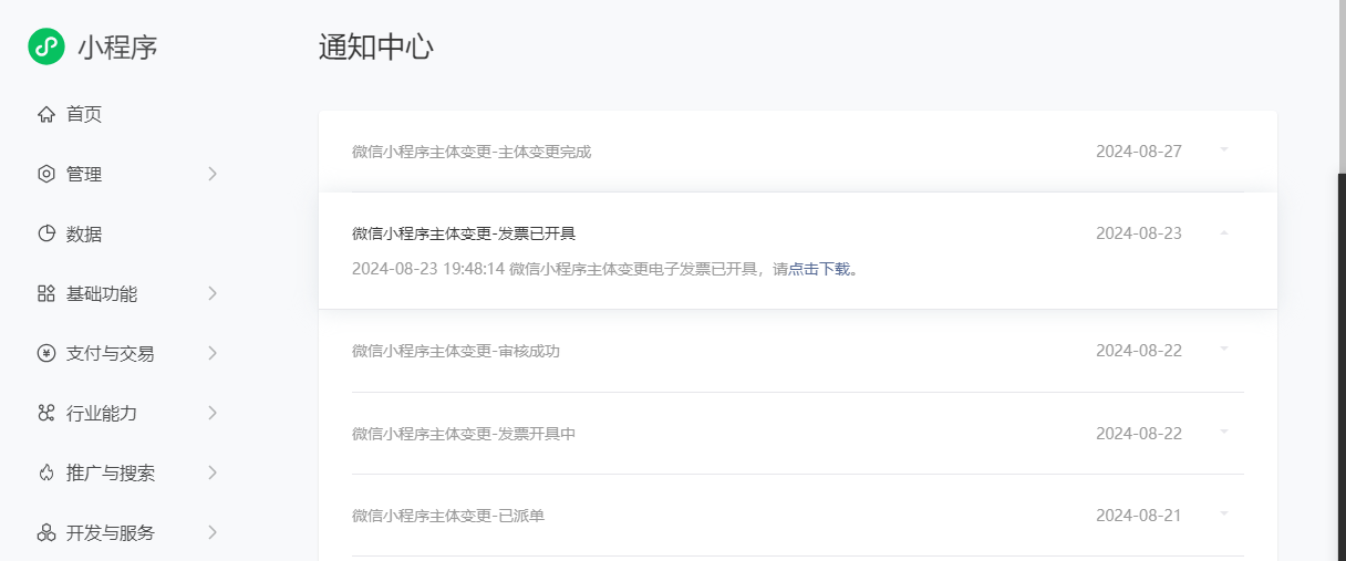小程序成功更换主体,想要下载之前的更换主体的费用发票,但是下载不了,换了浏览器都是一样的反馈界面,这是什么原因?或者有其他的下载路径吗?