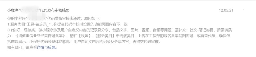 26日已经按照后台要求修改了相应类目和资料,新增了社交-笔记类目,并上传了备案截图,并且通过审核,之后再次发布小程序。