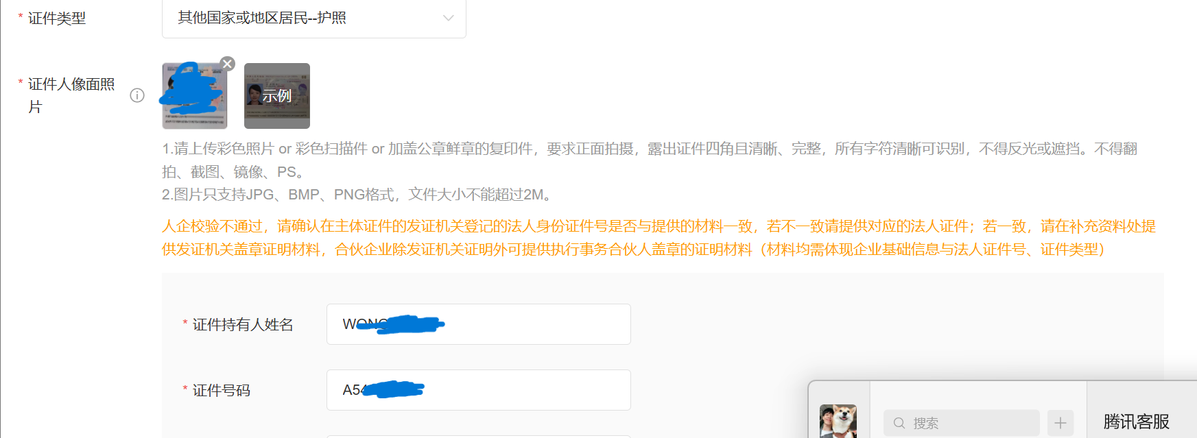 中国公司,法人是外国人,上传了该法人的护照,但是一直过不了审核,提示“人企校验不通过,请确认工商登记的法人身份证件号是否与提供的材料一致,若一致,请在补充资料处提供工商盖章证明材料(材料均需体现企业基础信息与法人证件号、证件类型)。”