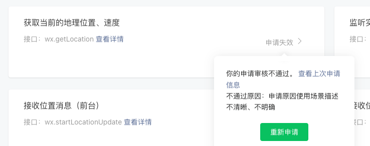 你好,申请wx.getLocation接口需同时满足类目开放范畴和接口使用场景开放范畴两个条件才可通过审核,建议在提交接口审核时详细描述下申请接口在小程序内业务场景使用的必要性,并提供小程序内申请接口相关截图和录屏辅助审核,以便快速通过审核。开放范畴详情参考:https://developers.weixin.qq.com/miniprogram/dev/api/location/wx.getLocation.html