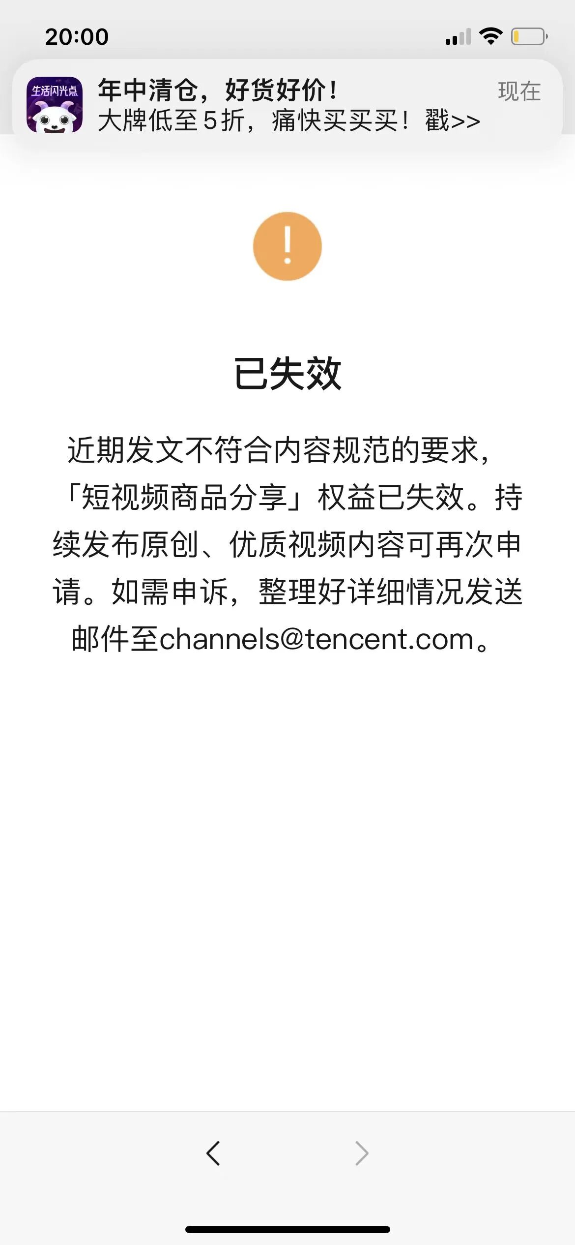 由于你近期部分发文为非原创、优质内容,你收到了商品分享权益通知或者商品分享权益已失效,持续发布原创、优质视频内容,符合要求后权益会再次自动开通,再次开通会有私信通知。如果你对处罚结果有异议,请复制申诉链接(https://channels.weixin.gg.com/pandora/pages/appeal/index#account-detail?appeal entrance=1)在手机微信打开,按照提示进行线上申诉即可