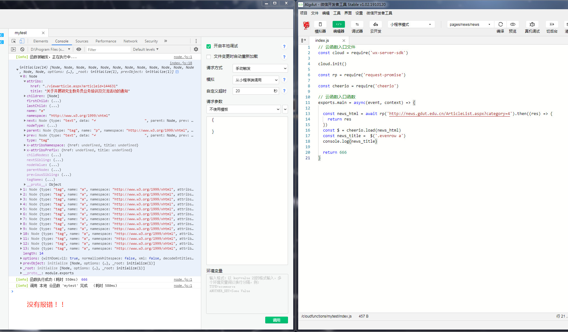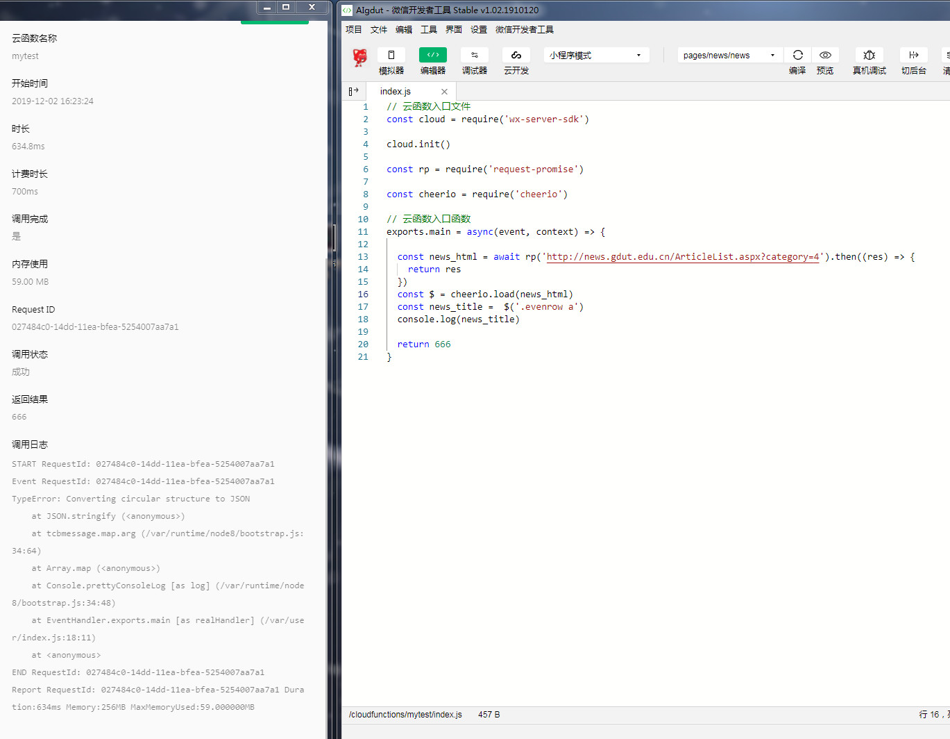 // 云函数入口文件const cloud = require('wx-server-sdk')cloud.init()const rp = require('request-promise')const cheerio = require('cheerio')// 云函数入口函数exports.main = async(event, context) => {const news_html = await rp('http://news.gdut.edu.cn/ArticleList.aspx?category=4').then((res) => {return res})const $ = cheerio.load(news_html)const news_title = $('.evenrow a')console.log(news_title)return 666}// 请问我的代码哪里有问题吗?我本地运行可以,云端却报错?同样的问题,看起来是小程序npm构建的问题。