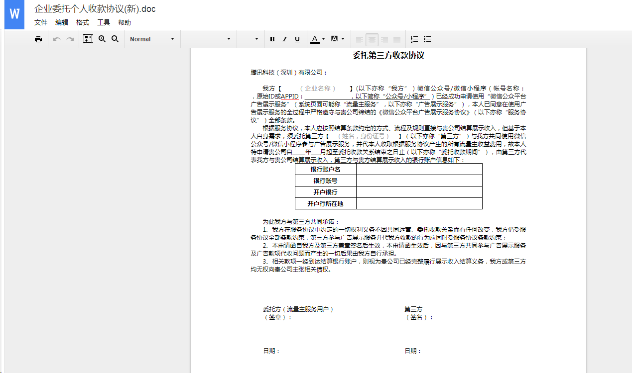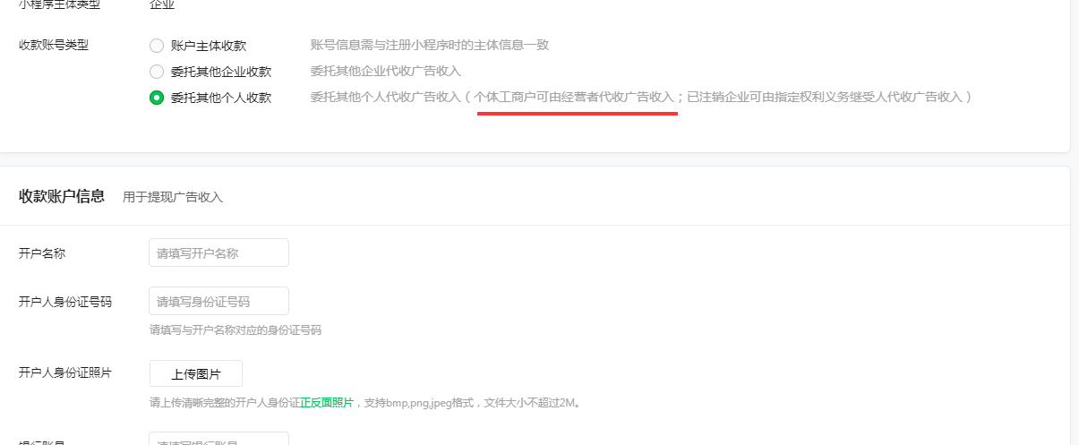用个体执照注册的小程序,开通流量主绑卡有三个选项,一个账号主体收款,一个委托其他企业,一个委托个人,前两个都要对公,后一个申请时要打印一份协议盖企业公章,问题是一个个体执照哪有什么公章,这种情况怎么弄的。