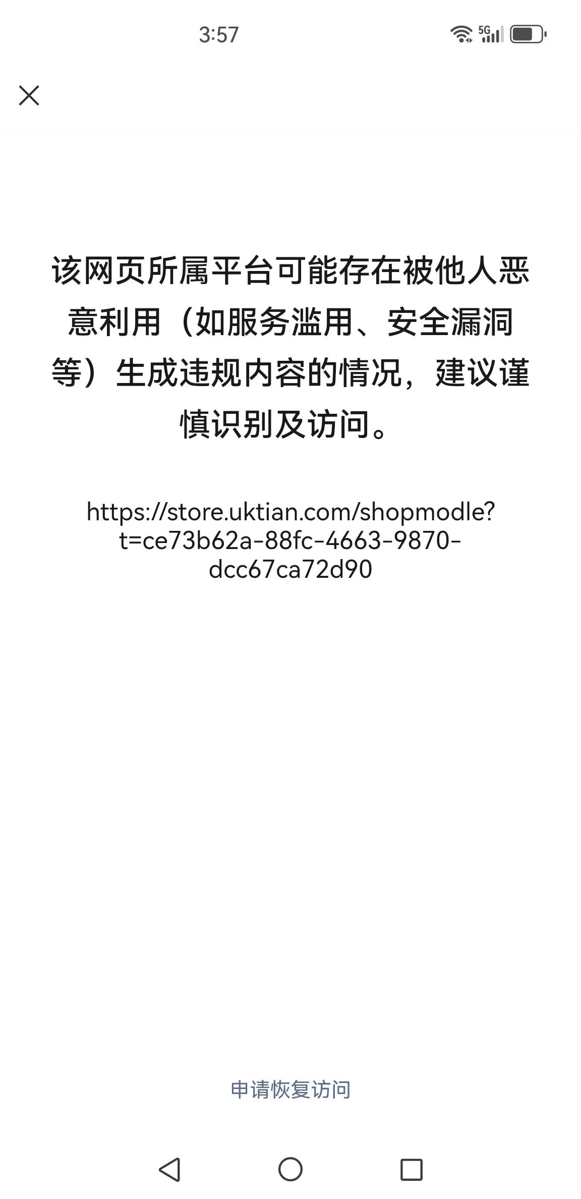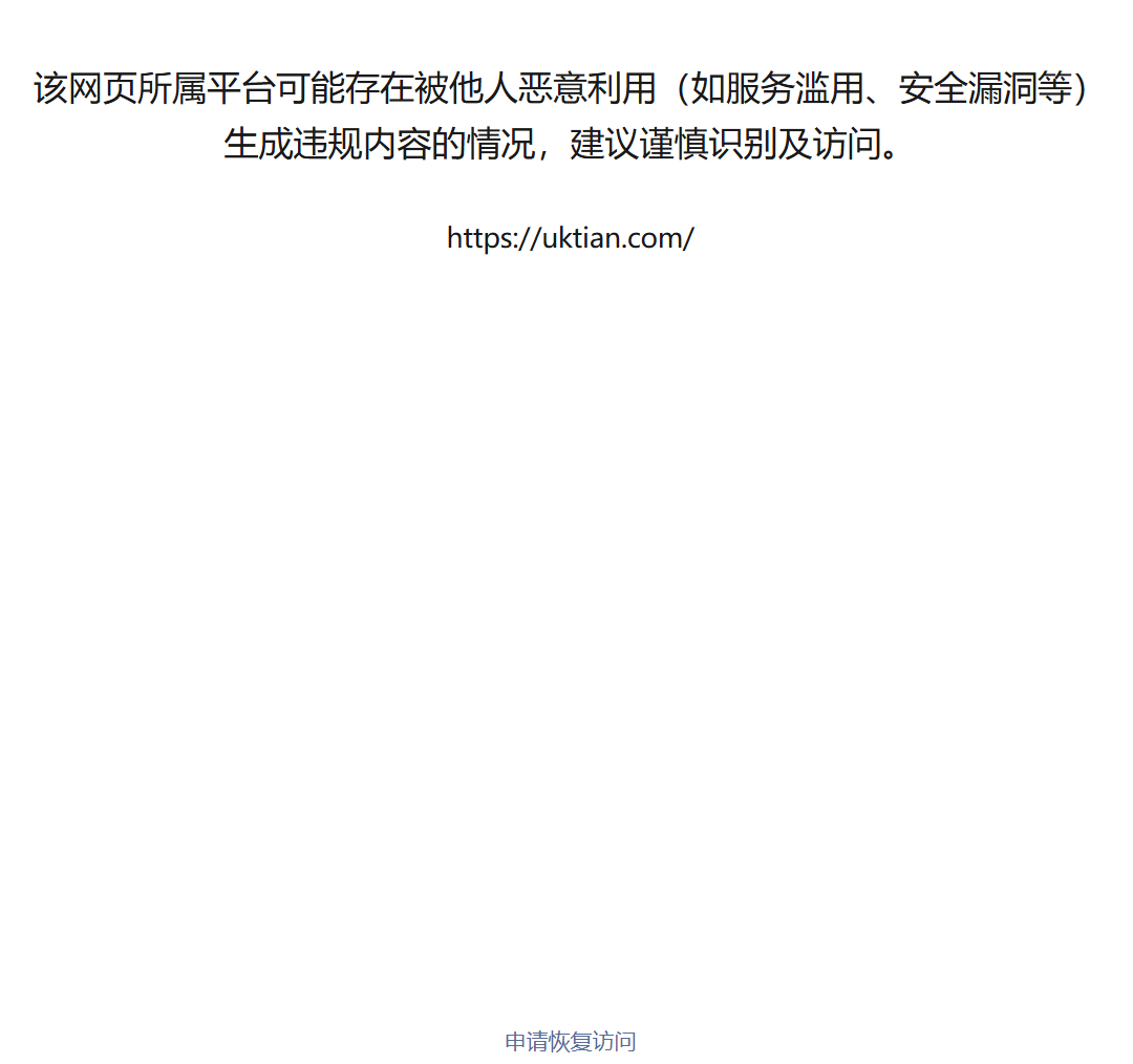 这个uktian.com旗下所有二级域名在微信内跳转链接都显示该网页所属平台可能存在被他人恶意利用(如服务滥用、安全漏洞等)生成违规内容的情况,建议谨慎识别及访问。这是怎么回事啊,我查看了没有违规内容啊,请官方帮忙看一下