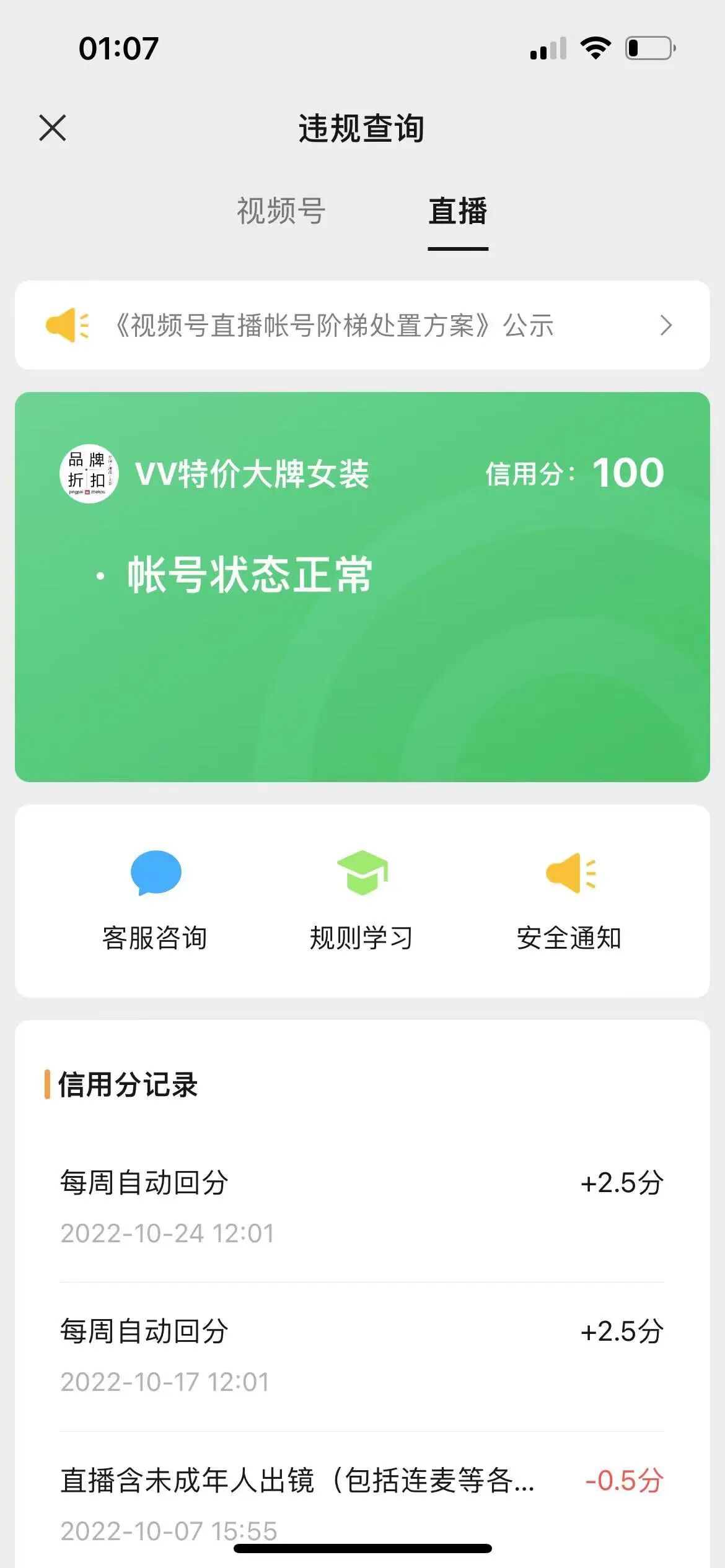 2022.10.31视频号直播时突 被禁播,没有提醒,为什么封,封多久,只是单纯说违反协议,没有申诉渠道。目前视频号是100分,显示状态正常没有任何违规,就是不允许开播,而且名下另一个账号也禁播,打电话给客服就像机器人回答术语,完全不是解决问题,和推诿给专人处理。讨要说法,客服不耐烦挂电话,而且72小时过去仍然没有解决问题。现在封号问题是怎么处理,违反哪一点哪一条,希望平台举证封号原因,和封号要多久,有没申诉路径。口罩问题之下,寄望于网上经济为这座城市添加活力,为本来不富裕家庭雪上加霜,更不应该一概而论一刀切。望有关部门给个合理的回答