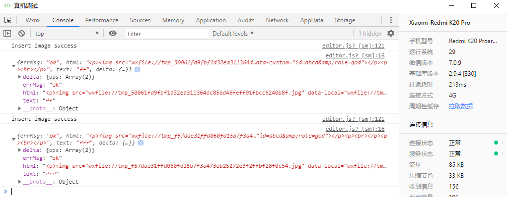 EditorContext.insertImage(Object object)插入图片。地址为临时文件时,获取的编辑器html格式内容中 <img> 标签增加属性 data-local,delta 格式内容中图片 attributes 属性增加 data-local 字段,该值为传入的临时文件地址。开发者可选择在提交阶段上传图片到服务器,获取到网络地址后进行替换。替换时对于html内容应替换掉 <img> 的 src 值,对于 delta 内容应替换掉 insert { image: abc } 值。还是说iOS返回的data-local是临时文件本身,而安卓返回的是临时文件地址