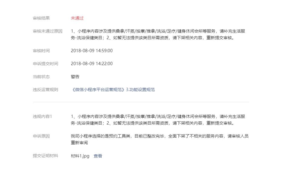 小程序的主体功能是预约系统,不涉及洗浴保健 ,已经按照要求下架相关内容了,仅保留预约功能,为什么还审核不过,请审核人员重新查明。