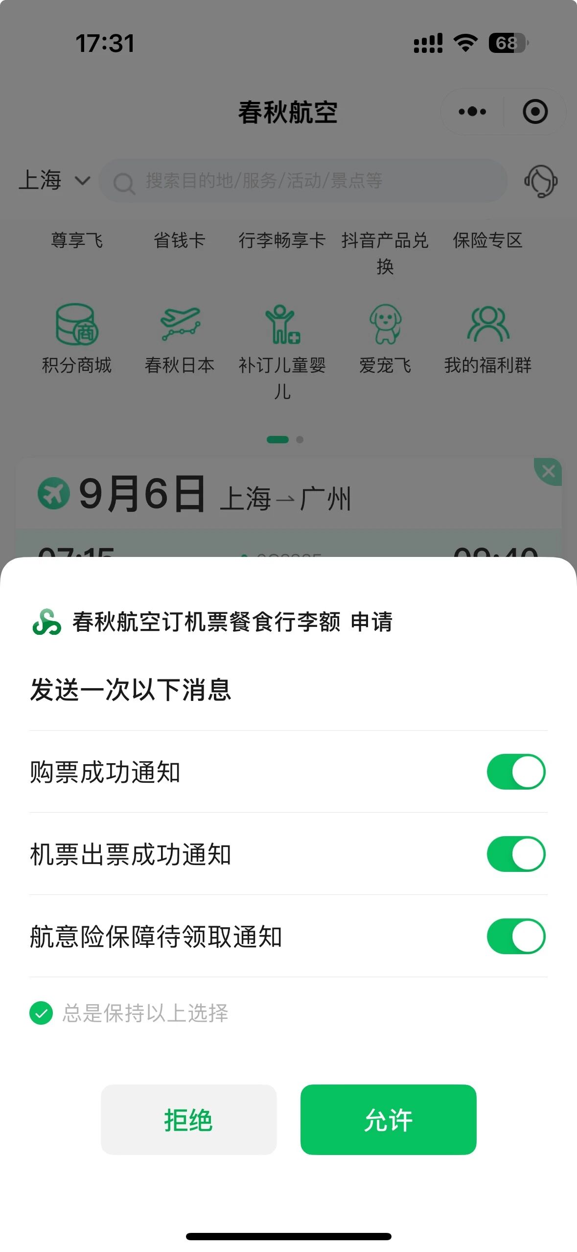 动作1:第一次在小程序页面中拉起了一次性消息授权浮窗,勾选了“默认保持以上选择”,并且打开通知。