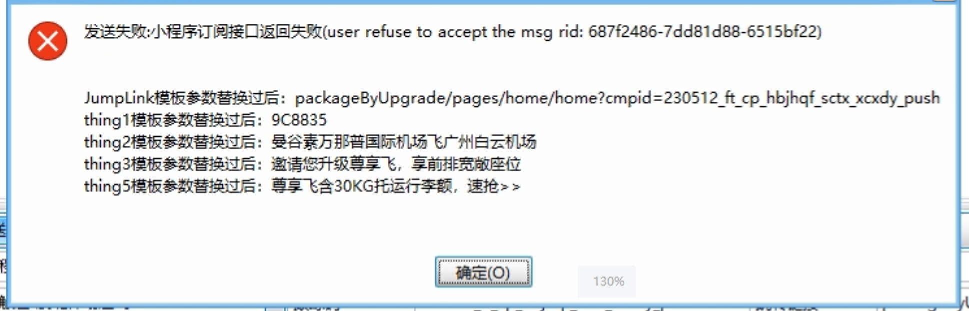 动作4:在CRM后台发送测试时,总是显示发送失败,提示用户拒收,且用户微信中确实也收不到推送的小程序消息了。