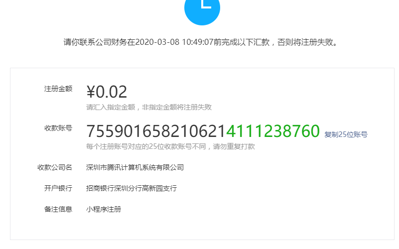 我在上个月27号注册了小程序(企业小程序),填写了企业相关的信息(营业执照啥的)后,系统需要我们公司公对公转一笔0.02元的“核对信息费”。