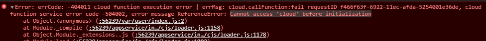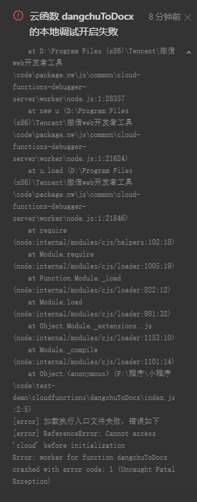 云函数本地调试开启失败,云函数调用失败,均显示问题是:Cannot access 'cloud' before initialization。云函数部署配置和上传均正常,