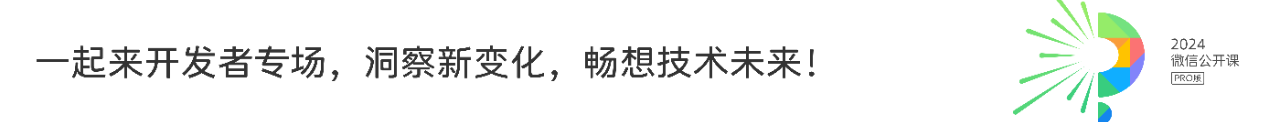 期待在 2024 微信公开课 PRO,与你洞察开发者生态新变化,一起畅想小程序技术的未来,共同创造更好的开发者生态!