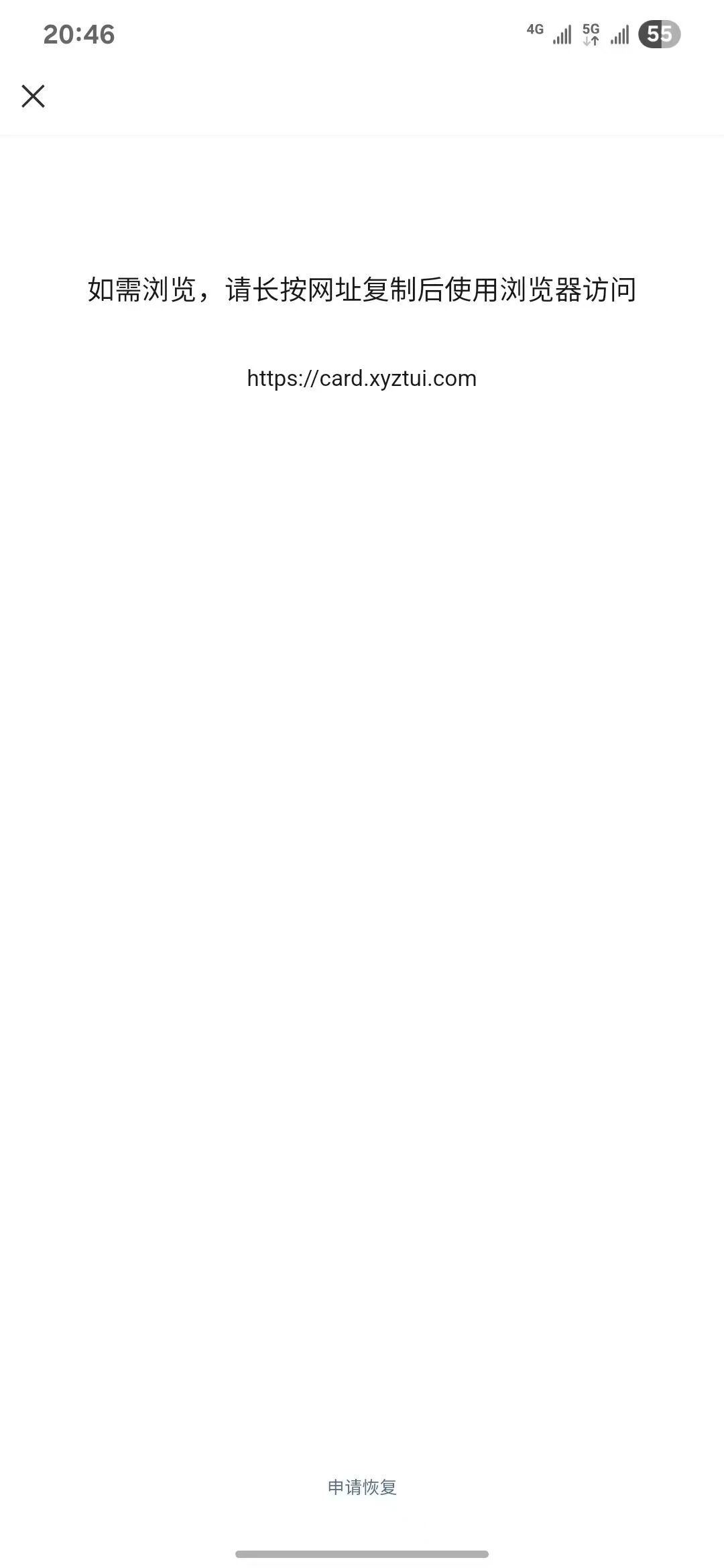 https://card.xyztui.com及下面的二级页面https://card.xyztui.com/home/#/card-apply/104?own_code=qRBx3g均为正常备案,且无危害信息,不知道是不是被人恶意举报,突然无法跳转,提示“如需浏览,请长按网址复制后使用浏览器访问",请帮忙反馈封锁原因,并帮忙解封,谢谢!!