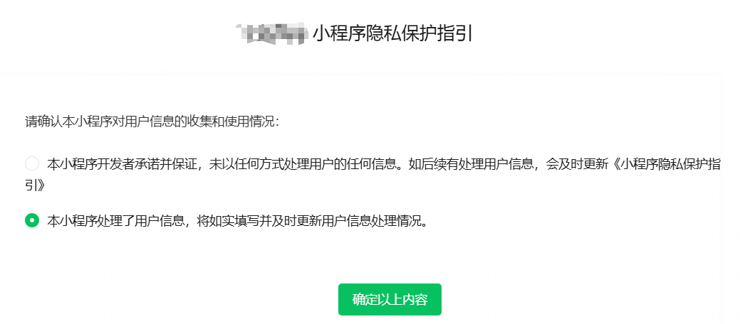 后续发版的时候,可以在代码提审页面底部完善用户隐私保护指引,审核通过且发布上线后即可生效。