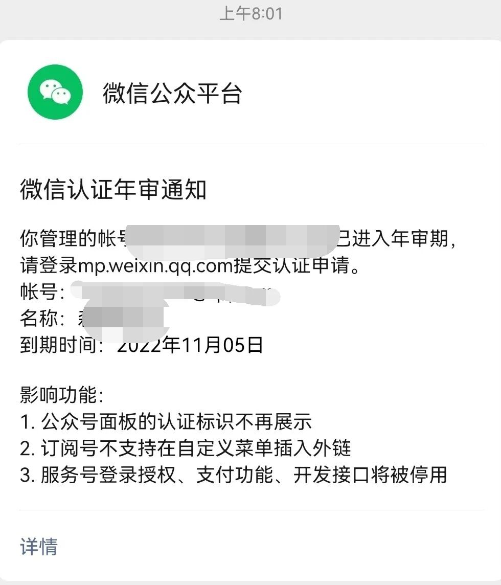 2,着急也可以直接进行微信认证,期限会在原有基础上增加1年,和年审效果是一样的。