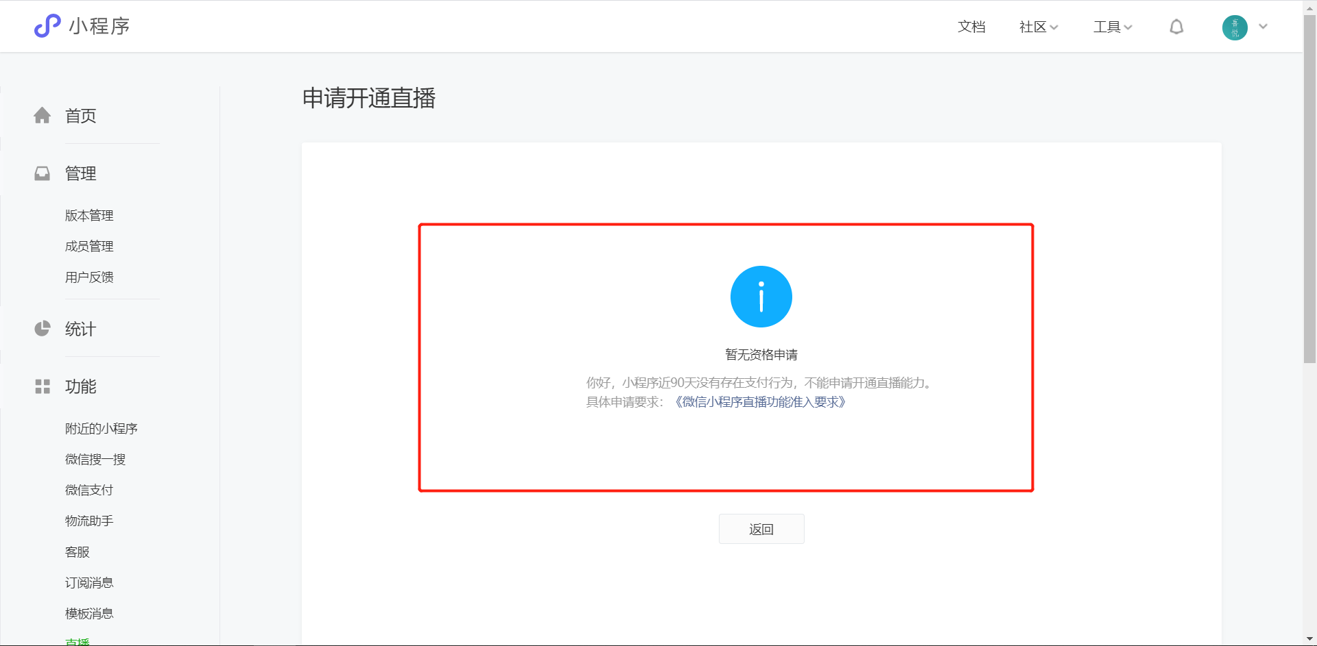 你好,经核实该小程序现已具备开通直播的能力,请重新申请开通。