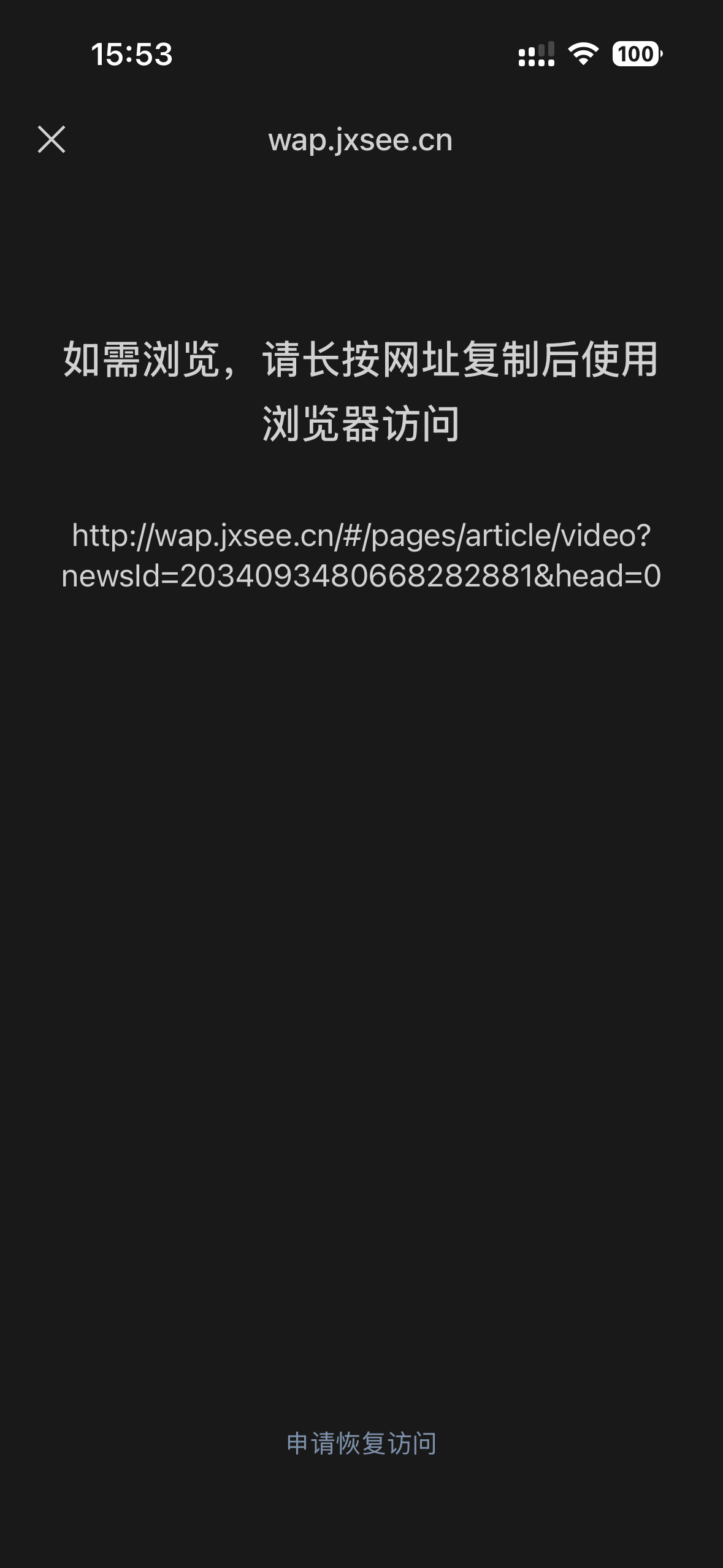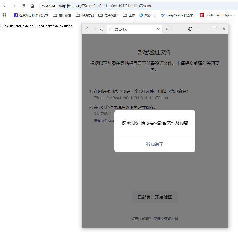 微信内置浏览器访问jxsee.cn包含下面二级域名网址均提示“如需浏览,请长按网址复制后使用浏览器访问”,能否告知禁止访问的理由或整改方案?申请恢复访问部署验证文件能否给出方案?验证文件其他浏览器均能访问,但开始验证提示校验失败。