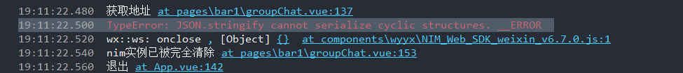 尝试过引入WebReflection/circular-json: JSON does not handle circular references. Now it does (github.com)修改云信聊天室源码,结果发现云信聊天室源码已经做了处理(说明不是云信代码包内部调用JSON.stringify 产生的问题),而云信的微信小程序聊天室示例是正常的,则说明是我写的代码问题,分析自己代码,最终发现如上问题,使得问题得到解决。