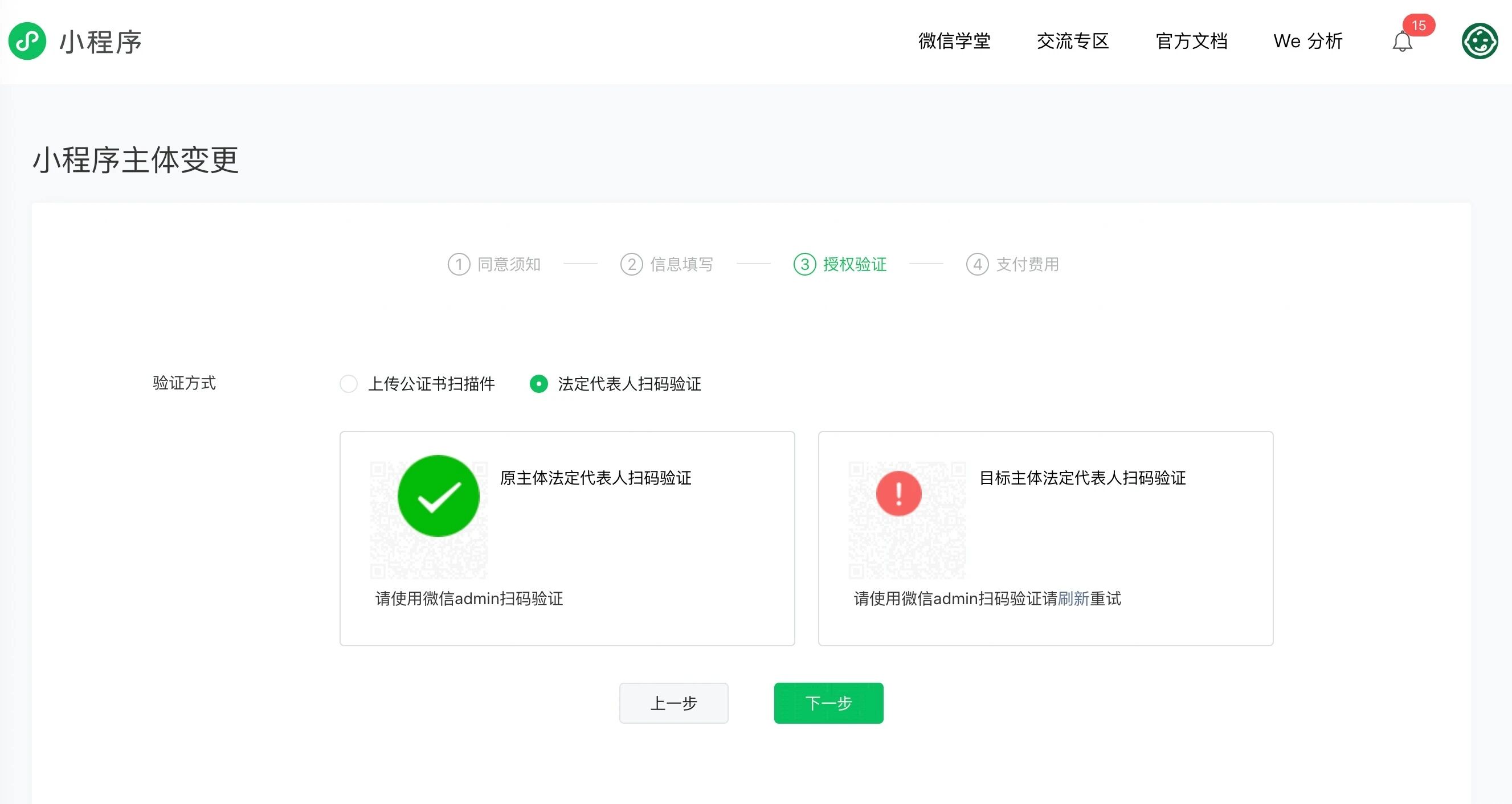 我小程序变更实体的时候,流程走不下去。我是前后两个实体的营业执照的法人是同一人。只是换个实体。现有流程走不下去。必须填写前后两个不一样的手机号,以及下一步的两个法人扫脸认证,但是我这个情况两个法人是同一人,流程不让继续走了已经。