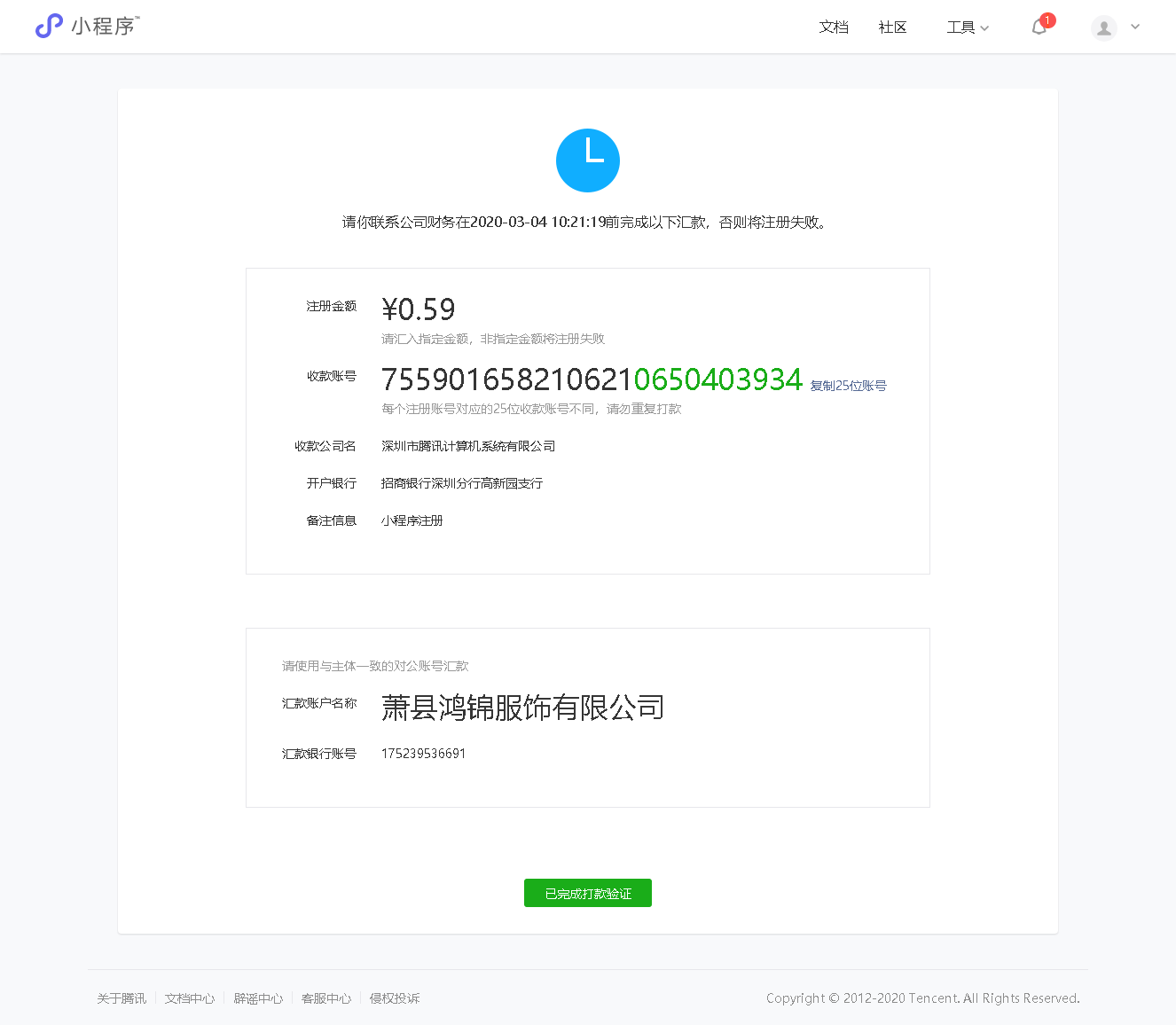 已经打过款项且信息无误,但是返回的消息是 ”超过10天未接收到指定账户的打款验证”, 可提供打款证明。