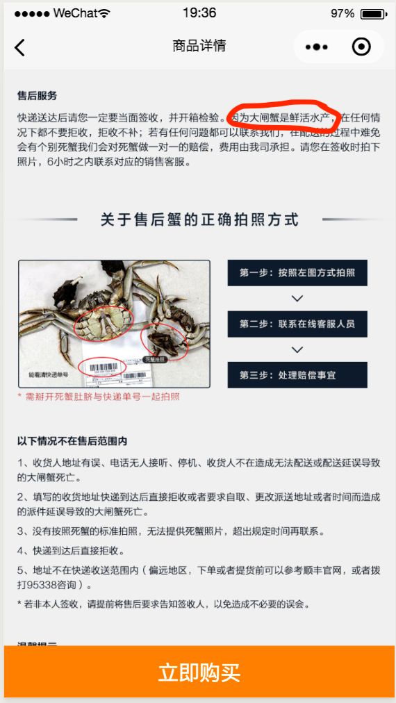 功能页面详情中关于大闸蟹是鲜活水产的说明及售后处理事项附图如下: