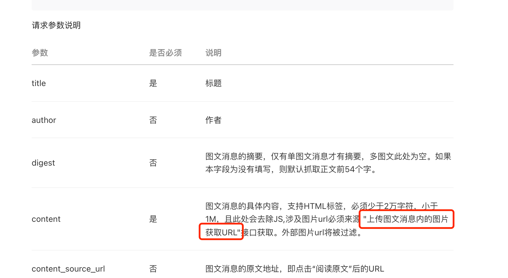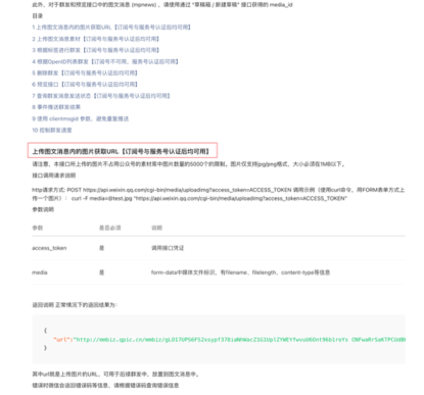 问题一: 公众号 草稿箱-新建草稿 接口文档中,请求参数【content】要求【涉及图片url必须来源 "上传图文消息内的图片获取URL"接口获取】, "上传图文消息内的图片获取URL"接口是指 https://api.weixin.qq.com/cgi-bin/media/uploadimg 吗?