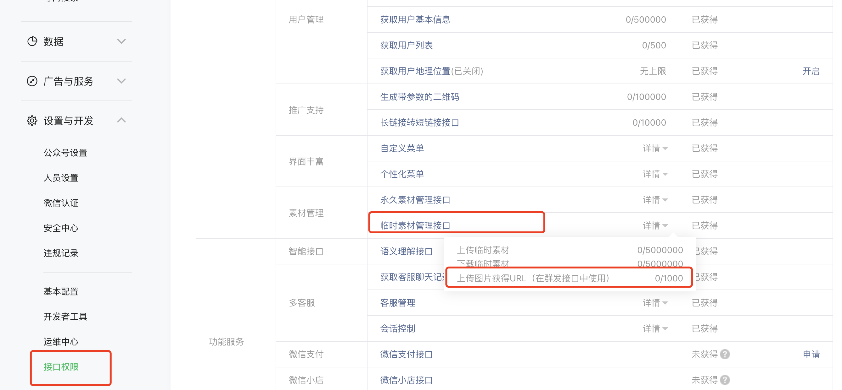 问题二:mp后台中公众号【接口权限】处【临时素材管理接口】处限【上传图片获得 URL 接口每天上限 1000 次】,是指 https://api.weixin.qq.com/cgi-bin/media/uploadimg 接口吗?