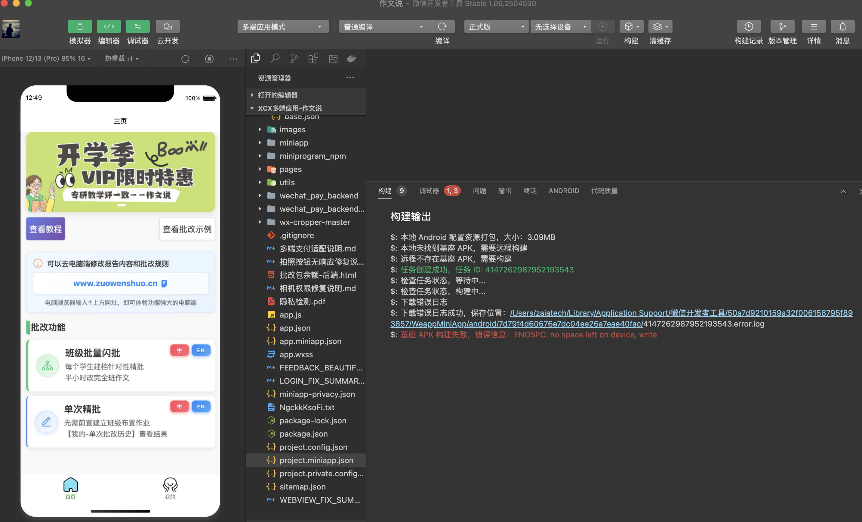 $:基座 APK 构建失败,错误信息:ENOSPC: no space left on device, write