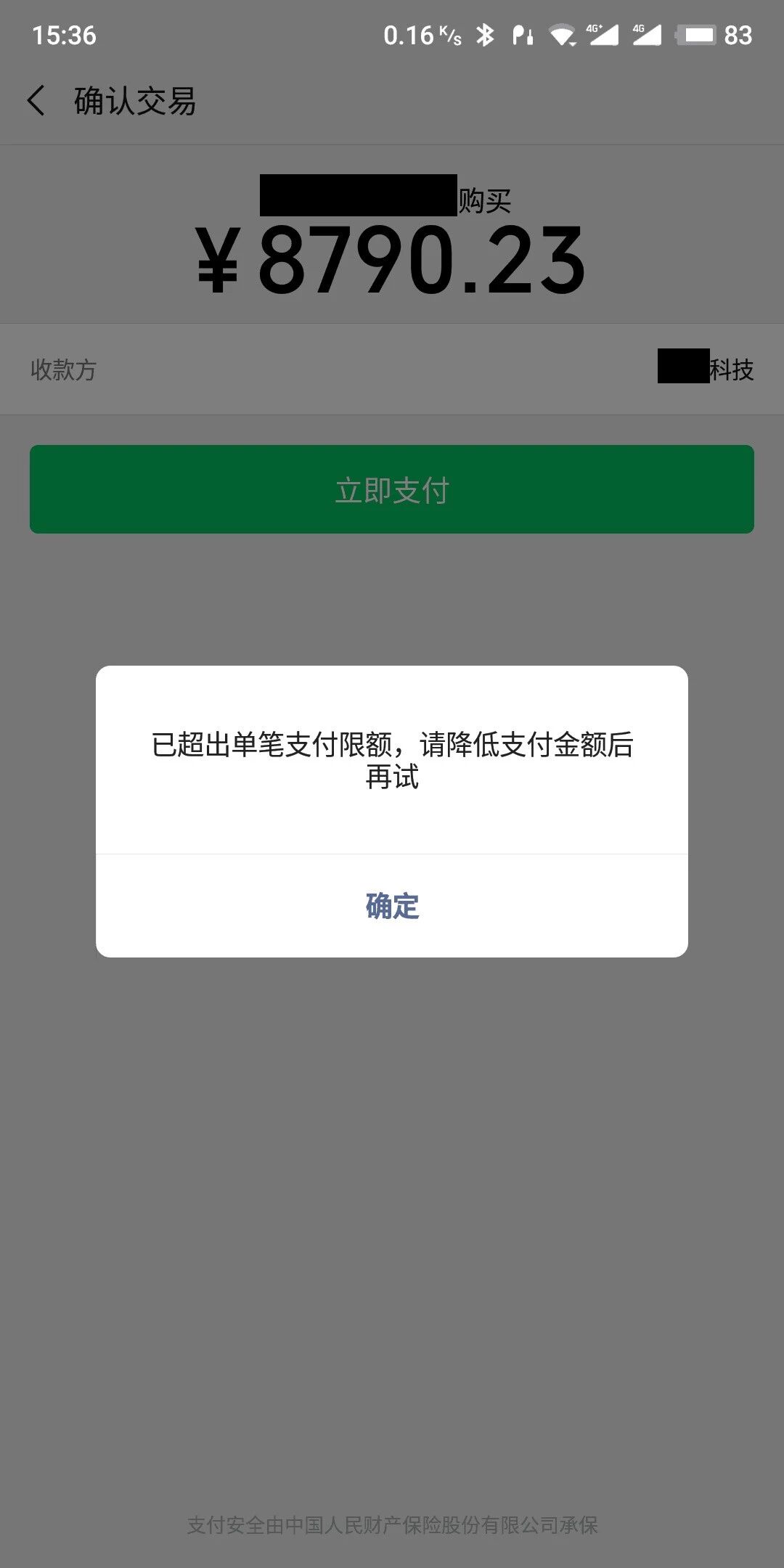 Native支付模式二,扫码提示单笔支付限额,已超出单笔支付限额,请降低支付金额后再试,请指教,是支付接口有限额吗?