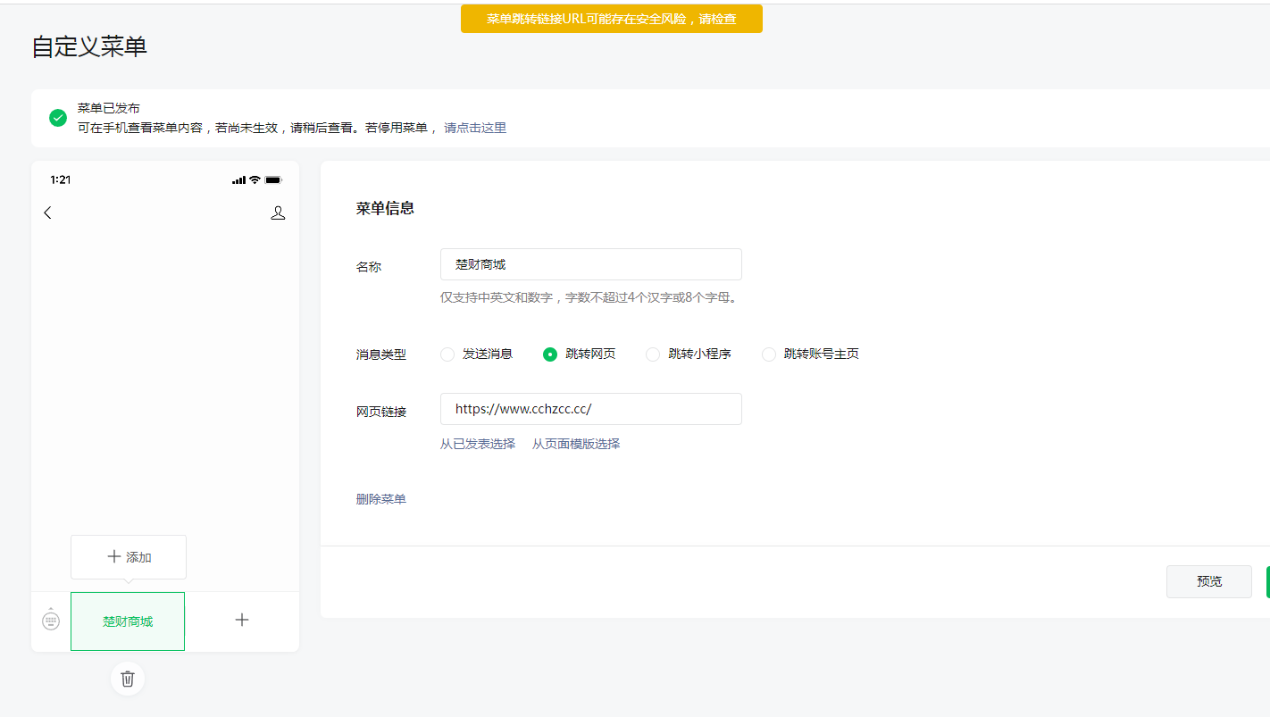 一开始我在微信上打开链接的时候,有安全提示我申请恢复了;但是这个公众号上添加链接地址菜单仍然添加不了,想问下有没有解决办法?链接地址是:www.cchzcc.cc