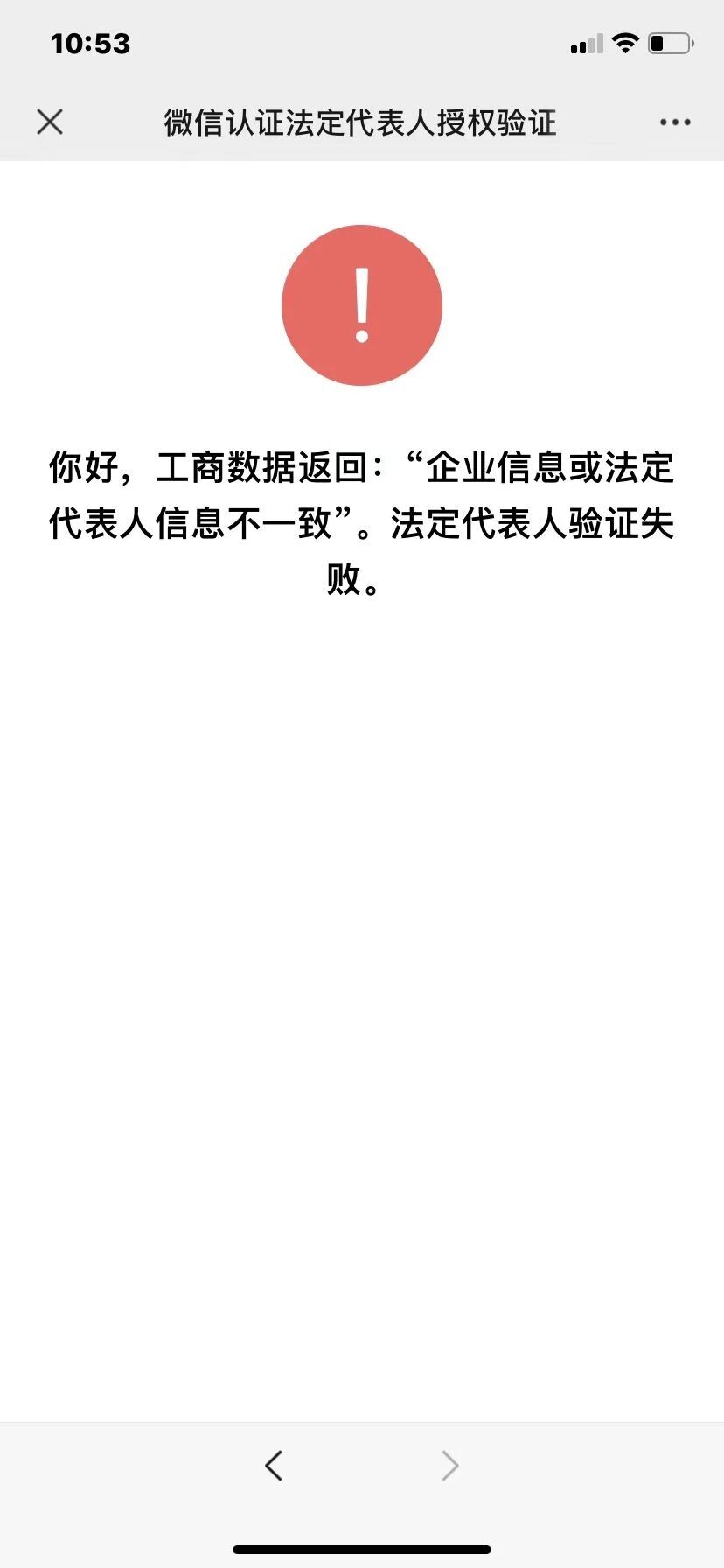 操作微信认证法人扫描时一直提示:法定代表人身份证号码,工商信息未更新,请5-15个工作日之后尝试,但营业执照是2016年8月办的,申请时填写的法人信息没有填写错误的,已经申请2遍了还是不行,着急使用微信公众号,麻烦大神协助下处理!申请邮箱号是:H13602681749@163.com