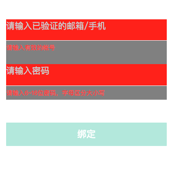 <form report-submit bindsubmit="pageSubmit"> <view class="content"> <view class="title fs_38 dark">绑定账号</view> <view class="input-content flex a_center space_between"> <input name="account" class="username" focus placeholder="请输入已验证的邮箱/手机" placeholder-class="input-style fs_34" bindinput="emailInput" bindfocus="emailFocus" bindblur="emailBlur" value="{{hasAccount}}" /> <span class="lg-wx-mina-input-del close fs_38" wx:if="{{hasAccount}}" bindtap="clearAccount"></span> </view> <view hidden="{{!emailTip}}" class="error-tip error-account">请输入有效的帐号</view> <view class="input-content flex a_center space_between"> <input name="password" class="password" password="{{true}}" placeholder="请输入密码" placeholder-class="input-style fs_34" bindinput="passportInput" bindblur="passportBlur" bindfocus="passportFocus" value="{{hasPassport}}"/> <span class="lg-wx-mina-input-del close fs_38" wx:if="{{hasPassport}}" bindtap="clearPassport"></span> </view> <view hidden="{{!passportTip}}" class="error-tip">请输入6~16位密码,字母区分大小写</view> <button form-type="submit" class="format-btn {{canSubmit ? '' : 'invalid-btn'}}" data-event="CLICK_BIND">绑定</button> </view></form> |