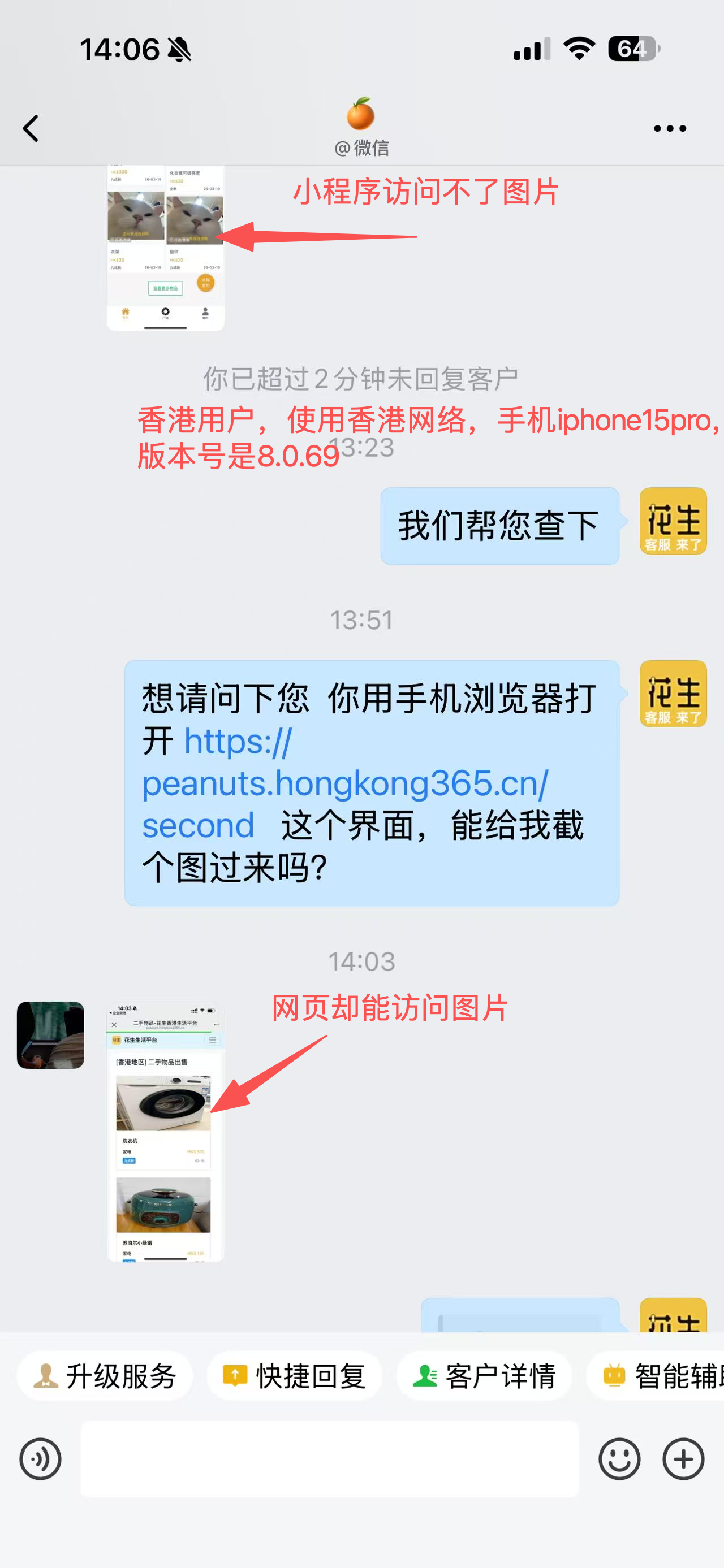 香港用户,访问我们微信小程序,所有图片加载不出来。但是他的手机,访问我们的移动端官网,却能加载出来对应图片。我们图片使用的是cdn服务,然后图片的地址是这个https://cc.hongkong365.cn/social/second/introduce/2026-03-19/oPBXs4spm8jyR4C5d6g0Dyuf-rVs_1773881508310_75725_12373.png 和 https://cc.hongkong365.cn/social/second/introduce/2026-03-19/oPBXs4spm8jyR4C5d6g0Dyuf-rVs_1773881252425_96157_97781.png 对应截图中香港用户访问出错的图片。