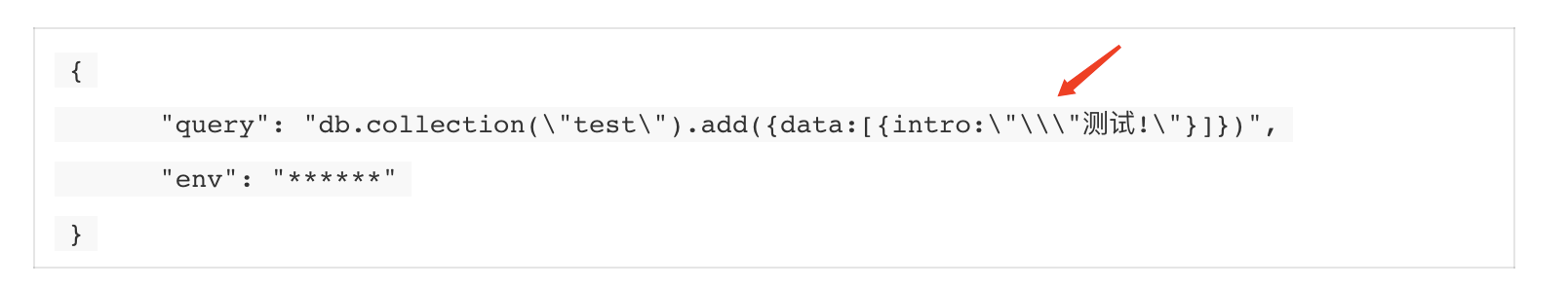 {"query": "db.collection(\"test\").add({"data":[{"intro":\"\\"测试!\"}]})"}{"errcode": 47001,"errmsg": "data format error hint: [tYfoKA06282162]"}不好意思这个确实转义比较多确实比较难看清楚,建议外围用单引号呢