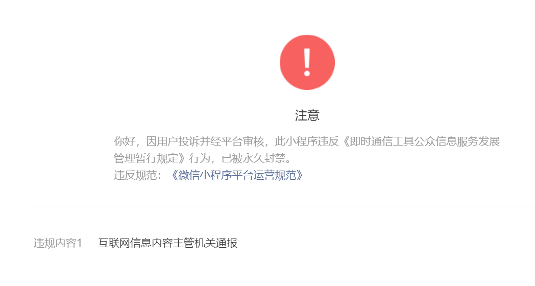 您好,我是一名小程序的运营者,从19年6月小程序上线以来,一会认真遵守官方公布的运营规范,一年多来没有一次违规记录,12月4日晚,突然微信推送给我消息,说我的小程序被永久封禁了,原因是“小程序违反《即时通信工具公众信息服务发展管理暂行规定》”,实在是太笼统了,整改也无从下手。请官方再给一次机会,让我找到违规的地方,把小程序再完善。多谢了!
