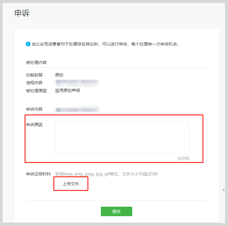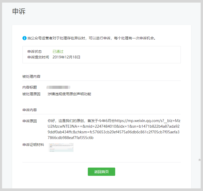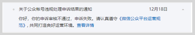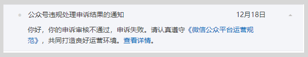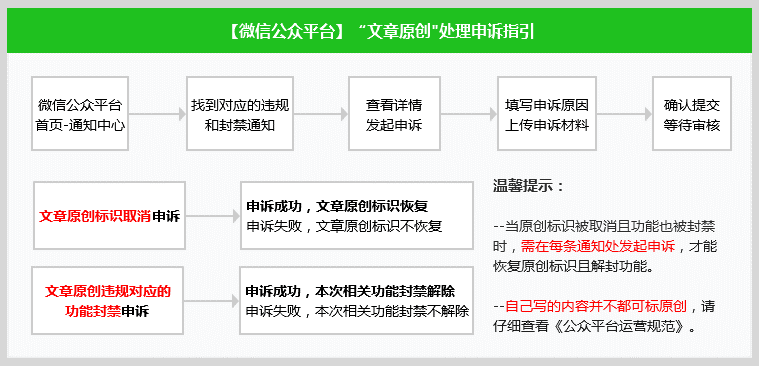 在收到相关处理通知后,如果你对平台的处理有异议,可前往微信公众平台通知中心找到对应的站内信通知,然后点击发起申诉,申诉需上传真实有效的相关证明材料,如申诉通过,文章和帐号相关功能即可恢复正常。