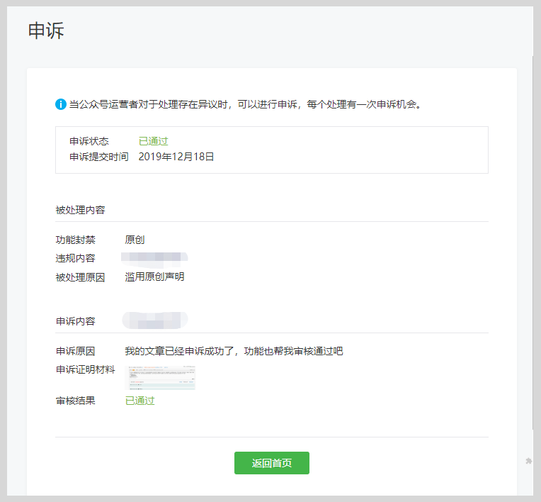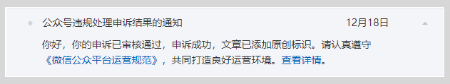 A:当一篇文章被平台判断为滥用原创后,其微信公众平台通知中心将会收到两条处理通知:取消原创标识、原创功能封禁,如有异议,需分别发起申诉。原创标识处理的申诉成功后,该文章会自动恢复原创标识。但功能封禁是对帐号层面的处理,想要申诉成功,需在同一时间段内被处理的所有文章都申诉成功,功能封禁才能解封,如果其中一篇文章申诉不成功,功能封禁则无法申诉成功,需等待封禁期限到期自动解封。