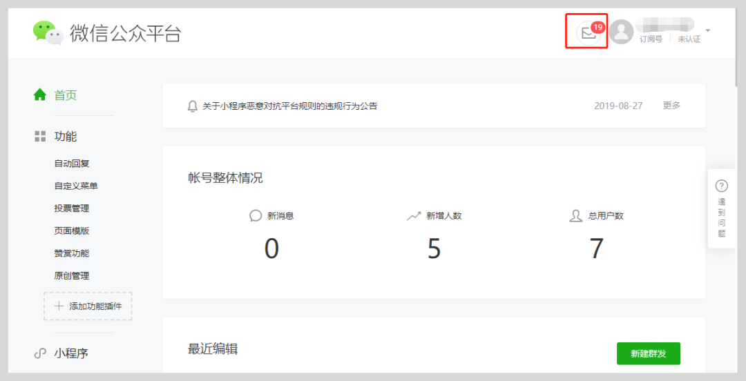 登录公众号,在首页右上角通知中心可以查看对应站内信。