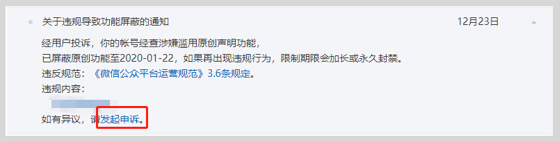 当文章被判定为滥用原创后,站内信将会收到两条处理通知:取消原创标识通知、帐号功能屏蔽通知,如有异议,需分别发起申诉。