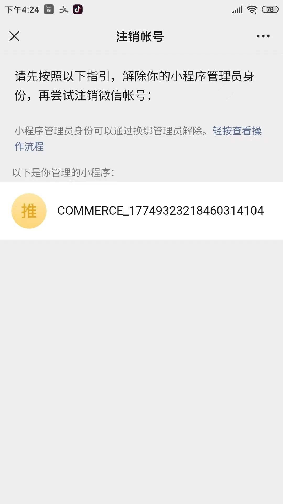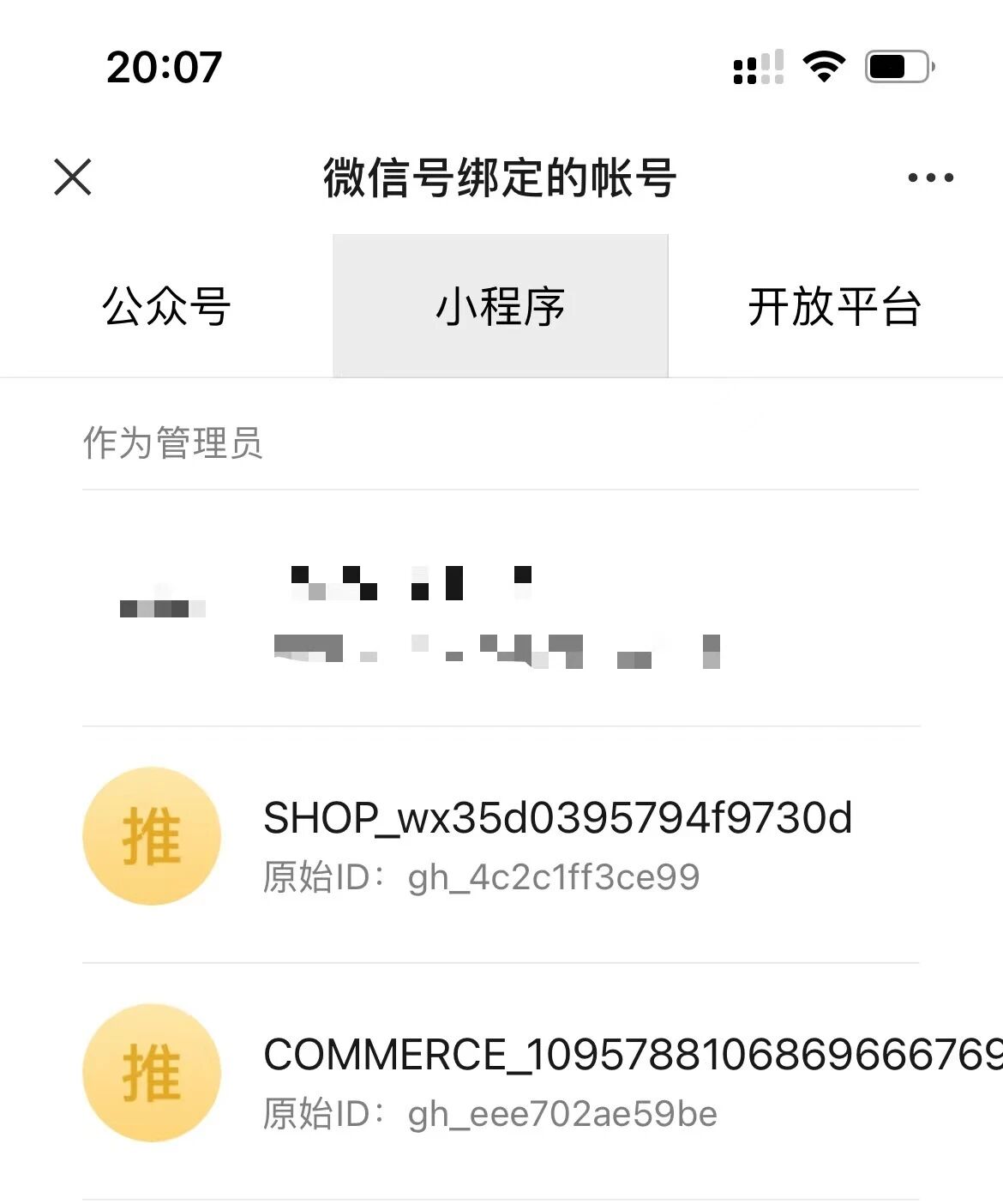 如图微信小程序联盟推客的账号能否注销?小商店也是俩,这个也是俩,这个还占用小程序绑定?