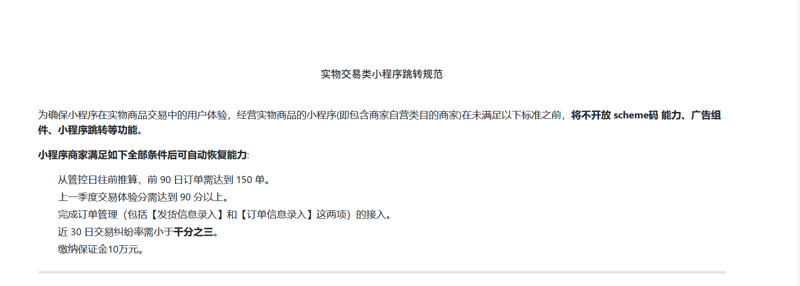 商家可按照小程序站内信跳转公告进行恢复跳转功能。若还有其他疑问商家可在该路径进行咨询下哈,路径:小程序管理后台https://mp.weixin.qq.com/ 支付与交易-订单管理-发货信息录入/订单信息录入-【实物电商类小程序】旁边的问号-平台客服咨询。
