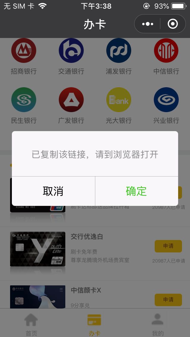 你好,经核实,小程序引导到浏览器实现在线申请信用卡,需补充金融业-银行类目,若小程序只为信用卡信息介绍,需更换小程序的展示形式。![]()