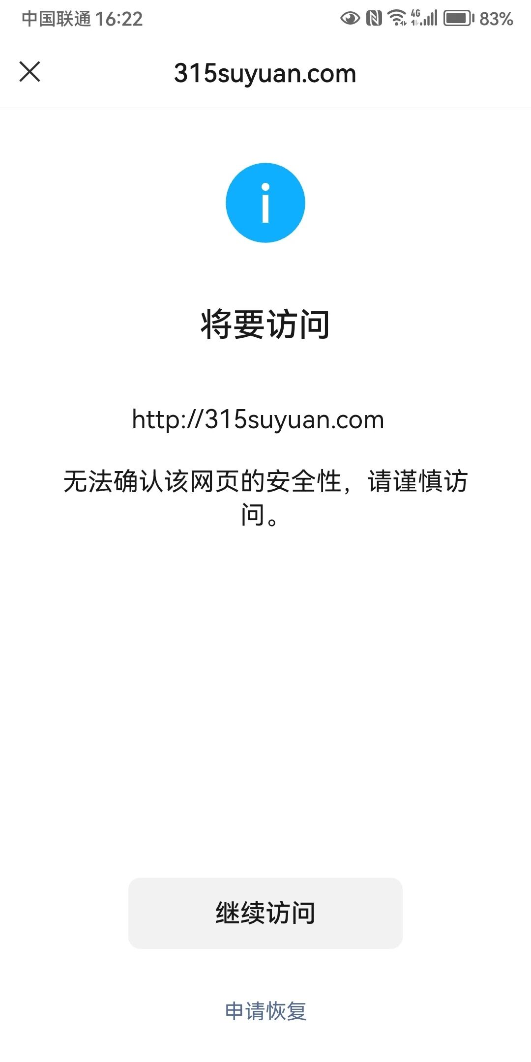 315suyuan.com是一个产品溯源系统网站,该网站已经通过工信系统备案,京ICP备15045263号-6,并受ssl证书系统加密保护,属于误报,请去掉访问提示词:该网站存在安全风险,请谨慎访